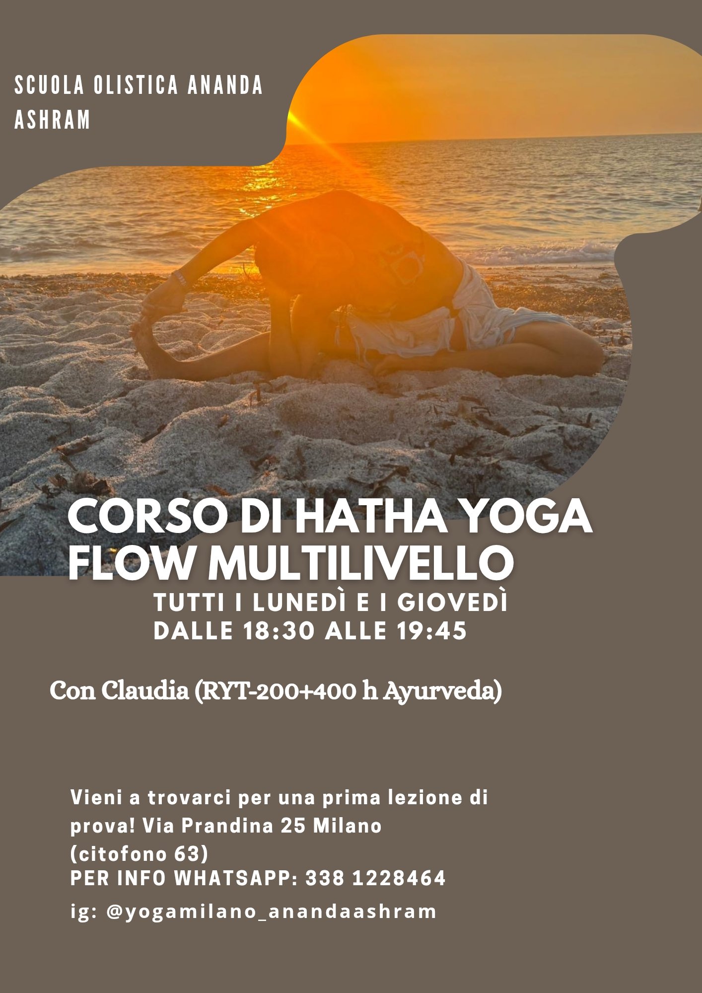 Lezioni di Hatha Yoga Flow da 75' adatte a tutti i livelli, con pratica fluida e dinamica, guidata dal respiro e attenzione agli allineamenti.